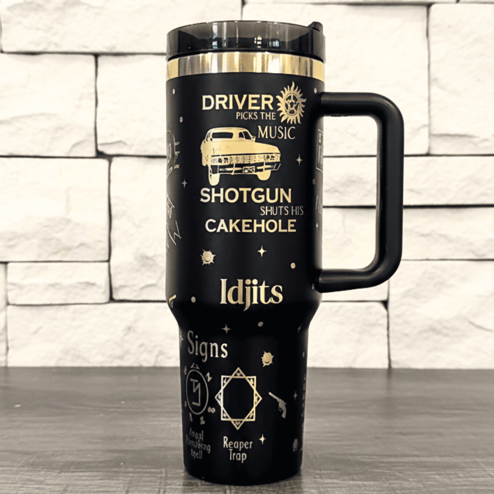 Que tal essa Garrafa Térmica 1.2L Edição Especial de Supernatural Customizada Dourado Gravação Laser para se presentear ou presentear aquele seu amigo fanático pelos Winchester?!